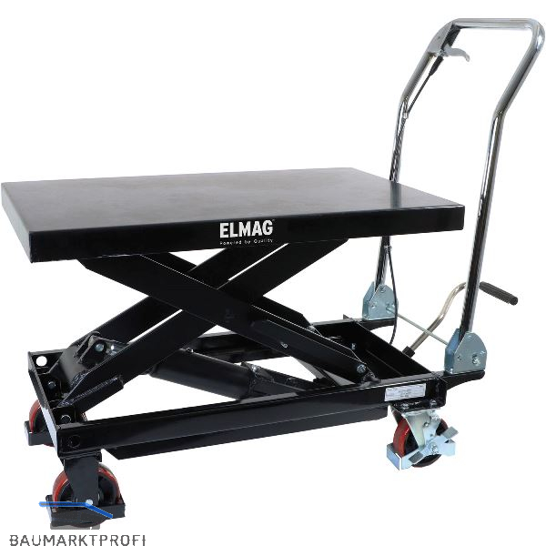 Der Scheren-Hubtischwagen ermöglicht mit der Handhebelentriegelung einfaches und kontrollierendes Absenken. Durch das anheben per Fußpedal ermöglicht er freihändige Bedienung. Er verfügt über 4 Hochleistungsrollen, davon sind 2 mit fußbetätigten Bremsen.