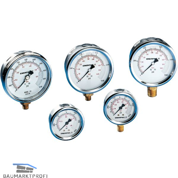 Druckanzeige mittels geeichter Skalenablesung in bar und psi. Alle druckempfindlichen inneren Teile werden zur Gewährleistung eines lange, störungsfreien Einsatzes durch das Glyzerin isoliert und gedämpft. Manometerdämpfungs- oder Nadelventile empfohlen. Skaleneinteilung: 10 bar, 100 psi.
