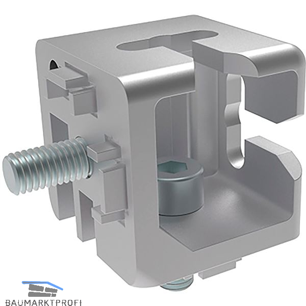 Zur rechtwinkligen Verbindung von zwei Aluminiumprofilen und zum Einhängen eines Rahmenelementes in eine Rahmenkonstruktion mittels geeigneter Aufhängung. Obere Aufhängung definiert die Position, Verriegelung erfolgt durch nachträgliches Verschieben der unteren Aufhängung.