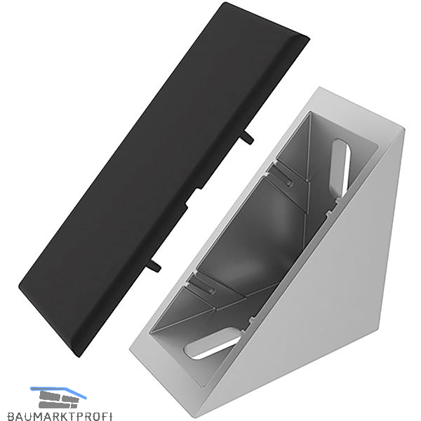 Zur rechtwinkligen Verbindung von Profilen und Flächenelementen. Die offene Seite des Winkels kann durch die Abdeckkappe verschlossen werden.