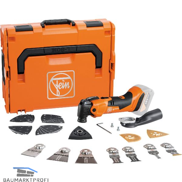 Lieferung inkl. E-Cut Long-Life Sägeblatt (10 mm), 2 E-Cut Long-Life Sägeblätter (35 mm), 2 E-Cut Long-Life Sägeblätter (65 mm), E-Cut Carbide Pro Sägeblatt (32 mm), HM-Sägeblatt (Ø 75 mm), HM Raspel (Dreieckform), Spachtel, Schleifplatte gelocht, je 5 Schleifblätter, gelocht (K 60, 80, 120, 180), Absaugvorrichtung, in L-Boxx 136.
