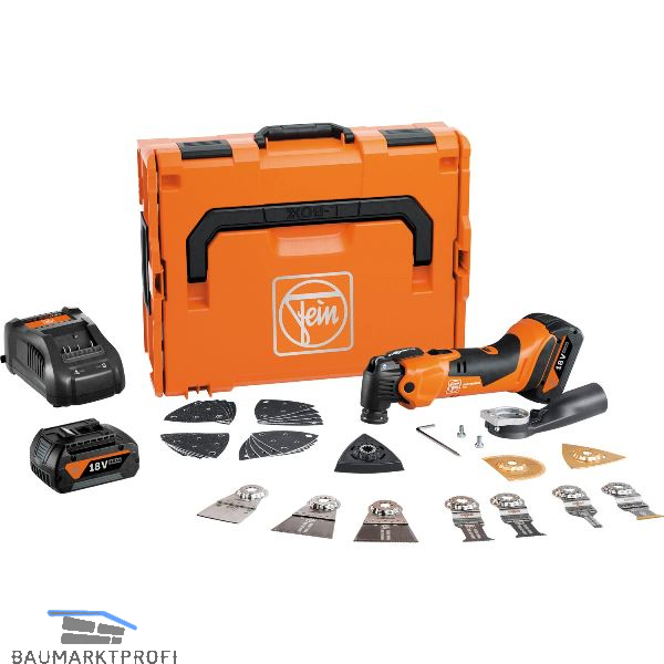 Lieferung inkl. E-Cut Long-Life Sägeblatt (10 mm), 2 E-Cut Long-Life Sägeblätter (35 mm), 2 E-Cut Long-Life Sägeblätter (65 mm), E-Cut Carbide Pro Sägeblatt (32 mm), HM-Sägeblatt (Ø 75 mm), HM Raspel (Dreieckform), Spachtel, Schleifplatte gelocht, je 5 Schleifblätter, gelocht (K 60, 80, 120, 180), Absaugvorrichtung, Schnellladegerät GAL 1880 CV, 2 Li-Ionen Akku-Packs (18 V / 4 Ah), in L-Boxx 136.