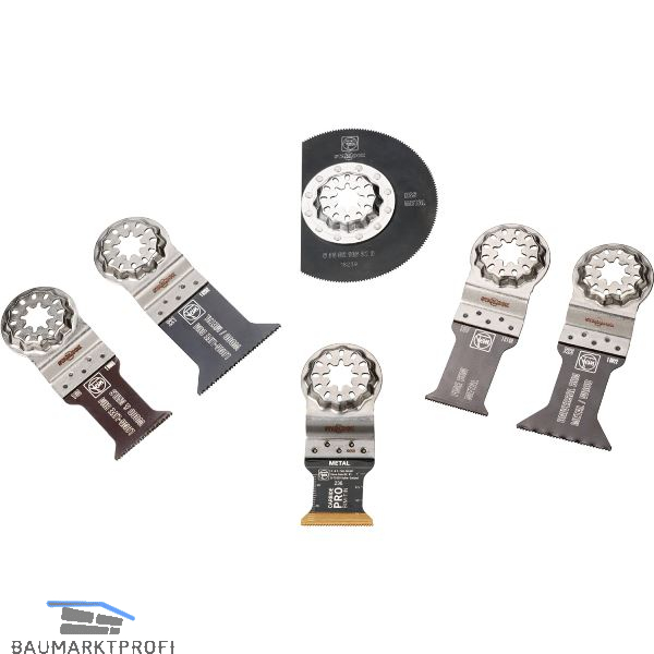 Lieferung inkl. E-Cut CarbidePRO-Sägeblatt (40 x 32 mm), je 1 E-Cut Long-Life Sägeblätter (50 x 35 mm und 50 x 50 mm), E-Cut Universal Sägeblatt (55 x 44 mm), E-Cut Fine-Sägeblatt (50 x 30 mm), Voll-HSS Segmentsägeblatt (Ø 85 mm)