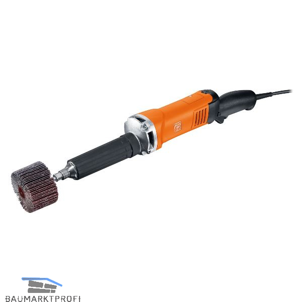 Geradschleifer mit ErgoGrip. Schleifkörper Ø max. 50 mm, Polierwerkzeug max. ø 80 mm. Elektronische Drehzahlvorwahl, Tachoelektronik, elektronischer Überlastschutz, austauschbarer Gummi-Halsüberzug. Langer, schlanker Hals ermöglicht tiefes Eintauchen in Werkstücke (z. B. Innenschleifen von Rohren). Spannhals-ø 43 mm.