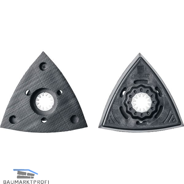 Standard Ausführung für das Schleifen mit Staubabsaugung. Kunststoff Trägerplatte zur Vermeidung von Beschädigungen und Markierungen auf dem Werkstück. Dreiecksform, gelochte Ausführung, Kletthaftteil.