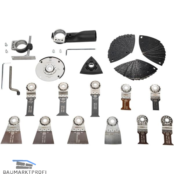 Lieferung inkl. 8 E-Cut Long-Life Sägeblätter (1 St. 34 x 20 mm, je 2 St. 50 x 35 mm und 50 x 65 mm, je 1 St. 78 x 32 mm und 78 x 42 mm), je 1 E-Cut Precision BIM-Sägeblatt (50 x 35 mm, 50 x 65 mm), 1 HSS Kreissägeblatt (Ø 100 mm), 1 Tiefenanschlag, 1 fester Spachtel lang, 1 Absaugung antistatisch, 1 Schleifplatte gelocht (80 mm), je 10 Schleifblätter gelocht (K 60, 80, 120).