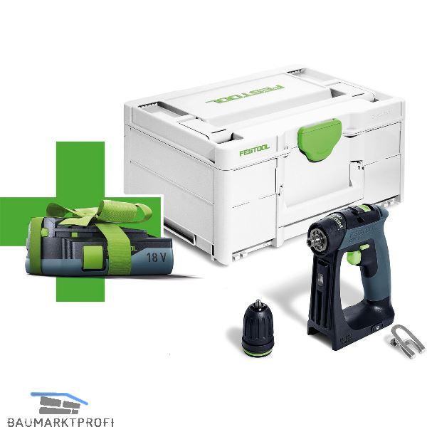 Lieferung inkl. 1 x Akkupack BP 18 Li 3 C, FastFix Schnellspannbohrfutter 10mm, Gürtelclip, Systainer SYS3 M 187.