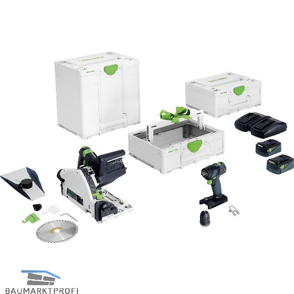 Lieferumfang: Akku-Tauchsäge TSC 55 5,0 KEBI-Plus/XL, Kreissägeblatt Wood Fine Cut HW 160x1,8x20 WD42, 2x Akkupack BP 18 Li 5,0 ASI, Schnellladegerät TCL 6 DUO, Sichtfenster, Splitterschutz, Staubfangbeutel, Systainer SYS3 M 437, Akku-Bohrschrauber TXS 18-Basic, Gürtelclip, FastFix Schnellspannbohrfutter 10 mm, Systainer SYS3 M 187, Systainer SYS3 TB M 137.
