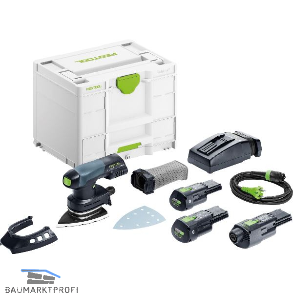 Lieferung inkl. 2 Akkus BP 18 Li 3,0 Ergo I, Ladegerät TCL 6, StickFix Schleifschuh 100 x 150 mm, Festool PROTECTOR, Longlife-Staubfangbeutel, Netzadapter ACA 18V ERGO (inkl. plug it-Netzkabel), im Systainer SYS3-Combi M 287.