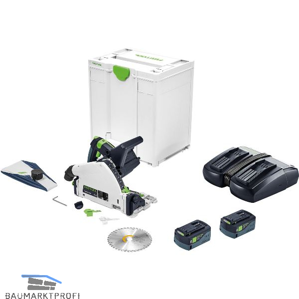 Lieferung inkl. 2 Akkus BP 18 Li 5,0 ASI, Schnellladegeräte TCL 6 DUO, Kreissägeblatt WOOD FINE CUT HW WD42, Sichtfenster, Splitterschutz, Staubfangbeutel, Innensechskantschlüssel SW 5, im Systainer SYS3 M 437.