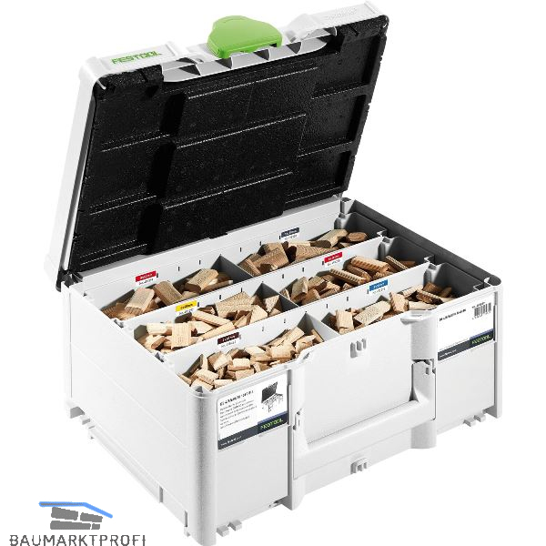 Im Domino Sortimentsystainer sind alle Dübelgrößen übersichtlich geordnet. Passend zu Dübelfräse DF 500.