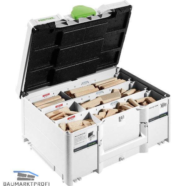 Lieferung inkl. DOMINO Dübel 8 x 50, 8 x 80, 8 x 100, 10 x 50, 10 x 80, 10 x 100 mm und DOMINO XL Fräser für die Größen 8 und 10, im Systainer SYS3 M 187.