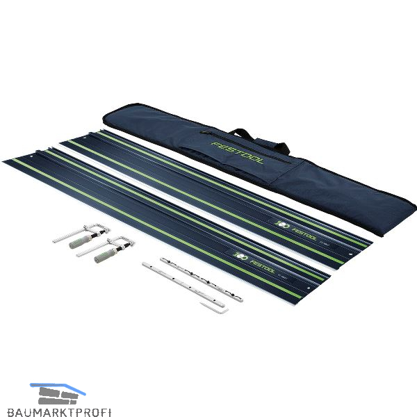 Inhalt: 2x Führungsschiene 1400 mm, Verbindungsstück, 2x Schraubzwinge, Tasche, im Karton.