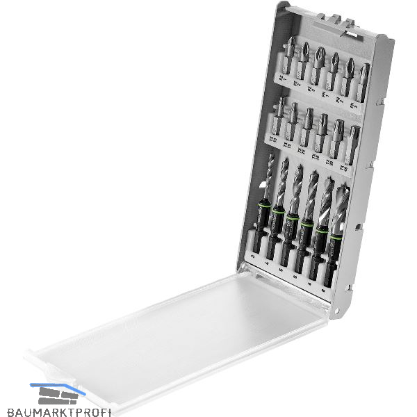 Übersichtlich verstaut und schnell griffbereit. Passt optimal in den Systainer3 mit Deckelfach. Bohrer und Bits werden sicher in Modulen gehalten, die flexibel versetzt werden können. Bohrer aus hochlegiertem Kugellagerstahl. Mit Zentrierspitze und 2 Schneiden für schnelle und saubere Bohrungendurch 2 Fasen anstelle von Vorschneidern wird auch in beschichtetem Plattenmaterial eine hohe Standzeit erreicht. Zum Bohren in allen Holzarten, verleimten Hölzern, MDF und Acrylglas. Aufgrund der kurzen Baugröße speziell für den Einsatz mit Winkelvorsätzen geeignet.