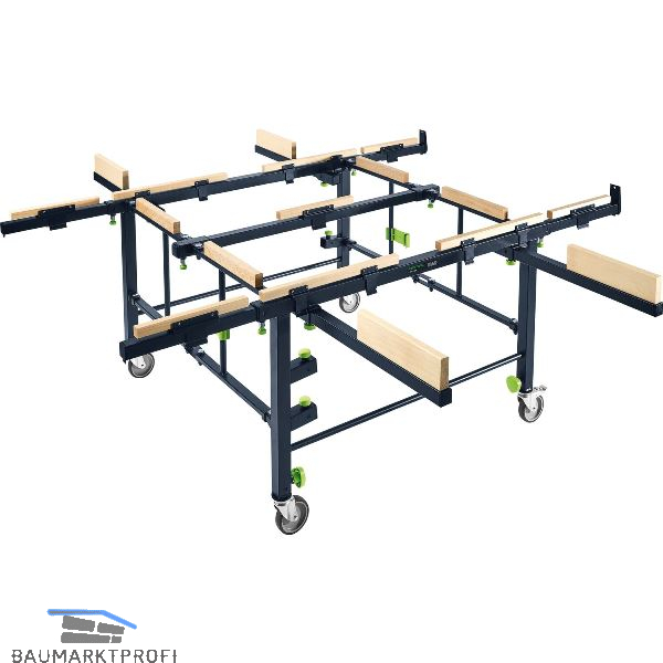 Holzauflagen stützen Plattenmaterial und Werkstücke jederzeit optimal ab und ermöglichen eine präzise Bearbeitung. Das Besondere: Selbst Platten bis zu einer Größe von 3100x2150 mm können von nur einer Person und ohne weitere Hilfe problemlos aufgenommen werden. Und für noch komfortableres Arbeiten ist der Tisch je nach gewünschter Arbeitshöhe bis 90 cm höhenverstellbar und verwandelt sich mit Handkreissäge und Führungsschiene zur mobilen Plattensäge. Kippfunktion und Höhenverstellung für ergonomisches und rückenschonendes Arbeiten. Holzauflagen stützen das Werkstück/Plattenmaterial jederzeit sicher ab und die Abschnitte bleiben sicher auf dem Tisch liegen. Je nach Bedarf klein und groß aufbaubar. Ausgestattet mit robusten Rollen und Bremsen. Leicht und kompakt zu transportieren durch spezielles Falt-System. Alle Teile sind am Produkt angebracht. Nichts geht verloren. Wird in Verbindung mit Handkreissäge, Führungsschiene und 90°-Winkelanschlag zur mobilen Plattensäge.
