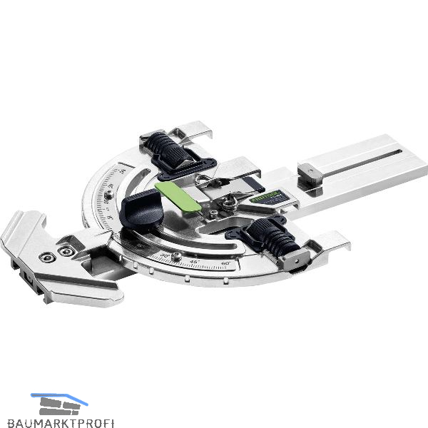 Der Winkelanschlag für die Führungsschiene – für präzise und schnelle Winkelschnitte. Der Winkel kann wiederholgenau und in hoher Präzision eingestellt werden. Der Winkelanschlag bietet damit einen großen Einsatzbereich und volle Flexibilität. Dank Schnellspannhebel ist der Winkelanschlag intuitiv und im Handumdrehen an der Führungsschiene angebracht.