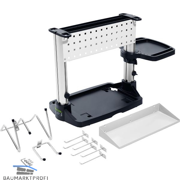 Mobilität auf kleinstem Raum. Werkzeuglos und einfach über Systainer-Schnittstelle (Classic oder T-LOC) auf den Festool Absaugmobilen befestigt, macht das Workcenter WCR 1000 jedes Festool Absaugmobil (außer CT 15) zum mobilen und bedarfsgerecht konfigurierbaren Kompakt-Arbeitsplatz. Flexible Ausstattung – Haken zur Aufnahme von zwei Maschinen mit Absaugschläuchen, Universalhalter, Ablagefach sowie eine drehbare Ablage für Kleinteile. Individuell erweiterbar – Lochblech und Profilnut können mit zusätzlichen Ablagen, Haken und Halterungen ausgestattet werden. Plateau zur Ablage von Kleinteilen inkl. Schraubenzieherhalterungen und 2 Relingen. Doppelter Werkzeughaken und doppelter Universalhaken zur Aufnahme des Werkzeugs und der Absaugschläuche. 4 Ösen zum Einhängen von z. B. Lappen und Spritzflaschen. Nut-Profil ermöglicht über die erhältlichen Passfedern die Anbringung individuellen Zubehörs.