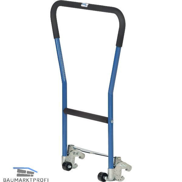 Einklinkbarer Schiebebügel für Paletten-Fahrgestelle. Ermöglicht ein einfaches und rückenschonendes Schieben von leeren und beladenen Paletten-Fahrgestellen. Die stabile Stahlrohr-Konstruktion hat starke Verbindungsklauen. Bügel und Querbügel sind mit einem rutschfesten Softgrip bezogen. Wenn der Bügel ausgeklinkt ist, helfen zwei Hilfsrollen beim leichten Bewegen. Nicht geeignet für leichte Fahrgestelle und Paletten mit 810 x 610 mm Ladefläche.