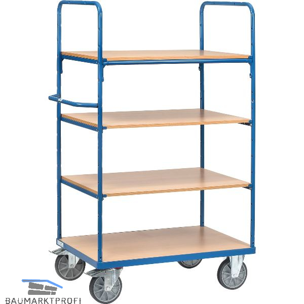 Stahlrohr und Profilstahl bzw. Winkelstahl geschweißt, pulverbeschichtet. 1 fester und 3 Einlegeböden aus tragfähigen, biegesteifen Sandwichplatten, Oberfläche mittelgrau. Einlegeböden variabel einsetzbar, im Raster von 100 mm. Tragkraft pro Einlegeboden 90 kg. 2 Lenk- und 2 Bockrollen.