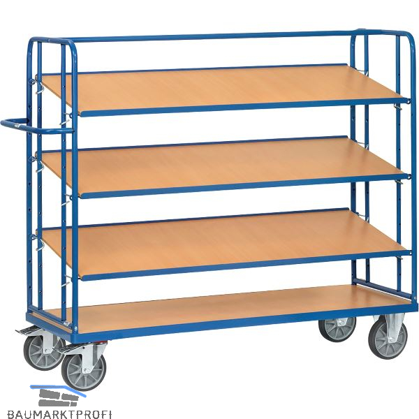 Stabiler Etagenwagen aus Stahlrohr und Profilstahl, pulverbeschichtet in RAL 5007. Ausgestattet mit einem festen sowie drei variabel einhängbaren Böden aus Holzwerkstoff mit Buchendekor-Oberfläche. Die losen Böden liegen in Winkelstahlrahmen mit 15 mm hohem Rand an den Längsseiten und sind im 120-mm-Raster höhenverstellbar. Zudem können sie mit ca. 15 und 30 Grad Neigung schräg eingehängt werden. Tragkraft pro Einlegeboden 80 kg. Ausgestattet zwei Lenk- und zwei Bockrollen, TPE-Bereifung und kugelgelagerten Naben. Feststeller an den Lenkrollen.