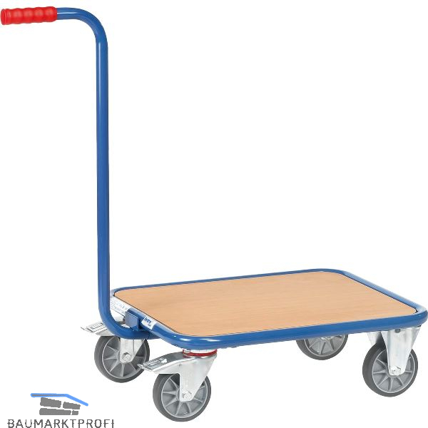 Die Plattform verfügt über eine im Rahmen liegende Holzwerkstoffplatte und ist mit TPE-Bereifung ausgestattet. Der Stahlrohrrahmen ist geschweißt und pulverbeschichtet. Anschraubbare Griffe ermöglichen eine einfache Handhabung. Ausgestattet ist der Griffroller mit zwei Lenkrollen, die Feststeller besitzen, sowie zwei Bockrollen. Alle Räder verfügen über TPE-Bereifung und Naben mit Rillenkugellagern für einen leichtgängigen und ruhigen Lauf.