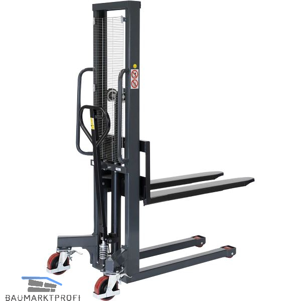 Hub- und Transportgerät für gelegentlichen Einsatz mit robuster Profilstahl-Konstruktion, pulverbeschichtet in Anthrazit RAL 7016. Ausgestattet mit Hydraulikpumpe, verchromtem Kolben, Überlast- und Senkventil. Bedienung erfolgt über Zugdeichsel, Hubhöhe je Deichselschlag beträgt 12,5 mm. Zwei Lenkrollen aus Polyurethan mit Feststeller und zwei Gabelrollen aus Nylon. Lastschwerpunktabstand 585 mm.