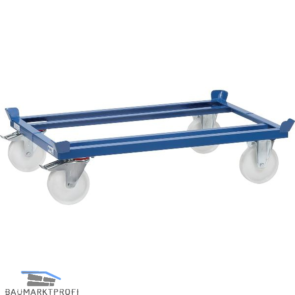Fahrgestelle für Flachpaletten und Gitterboxen. Robuste Winkelstahl-Schweißkonstruktion, mit 4 Fangecken, pulverbeschichtet. 2 Lenk- und 2 Bockrollen, Feststeller an den Lenkrollen. Naben mit Kugellager. Geringer Anfahr-, Roll- und Schwenkwiderstand.