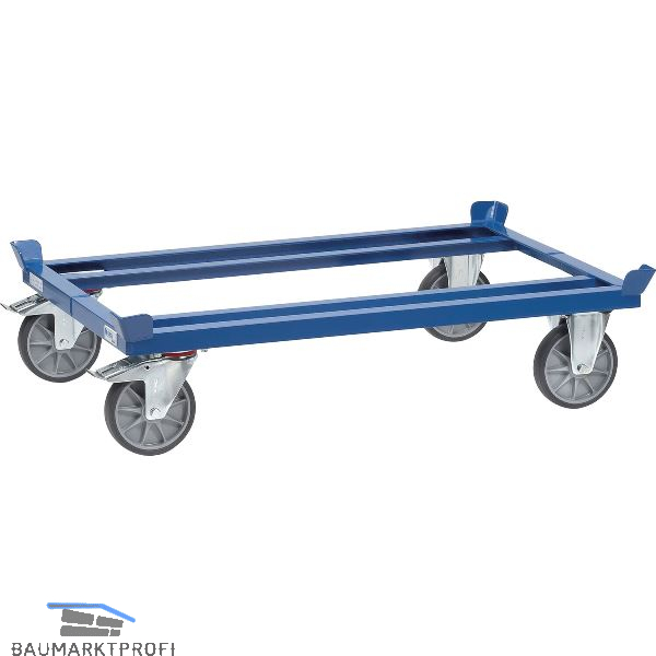 Fahrgestelle für Flachpaletten und Gitterboxen. Robuste Winkelstahl-Schweißkonstruktion, mit 4 Fangecken, pulverbeschichtet. 2 Lenk- und 2 Bockrollen, Feststeller an den Lenkrollen. Naben mit Kugellager. Geringer Anfahr-, Roll- und Schwenkwiderstand.