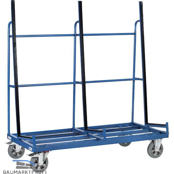 Zum sicheren Transport von Glasscheiben, Holz- und Kunststoffplatten sowie kompletter Fenster und Türen. Profilstahl und Stahlrohr geschweißt. Pulverbeschichtet, brillantblau RAL 5007. 2 Lenk- und 2 Bockrollen, Vollgummi-Elastic-Bereifung, blaugrau spurlos, Naben mit Kugellager. Feststeller an den Lenkrollen.