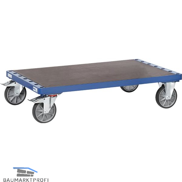 Der Palettenwagen besteht aus pulverbeschichtetem, geschweißtem Profilstahl und Stahlrohr. Die Plattform ist aus Holz. 7 Verstellmöglichkeiten für Einsteckbügel. Der Abstand zwischen den Bügeln beträgt 90 mm. Der Wagen hat zwei Bockrollen und zwei Lenkrollen mit Feststeller. Die Räder sind mit TPE-Bereifung ausgestattet, die Naben besitzen Rillenkugellager.