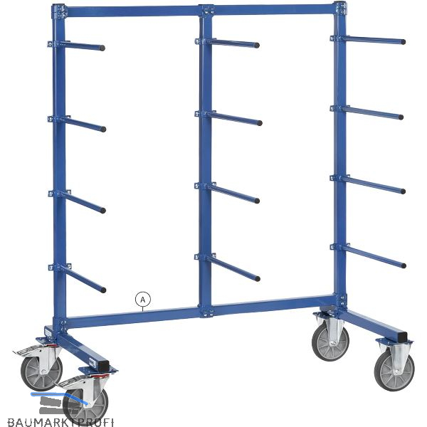 Ein variables System für Langgut-Transporte und -Lagerung. Tragarme stufenlos verstellbar, Wagen komplett verschraubt. Rahmen aus stabilem Quadratrohr. Rollen-Traversen, Pfosten und Streben durch kräftige Schraubschellen verbunden. Tragarme aus Stahlrohr Ø 27 mm mit Schraubschellen. Pulverbeschichtet brillantblau RAL 5007. 2 Lenk- und 2 Bockrollen, TPE-Bereifung, Naben mit Rillenkugellager. Feststeller an den Lenkrollen.