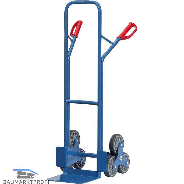 Stabile Schweißkonstruktion, mit Stahlblechschaufel, pulverbeschichtet. Sicherheitsgriffe. Mit 2 Rad-Sternen, Naben mit Kugellager. Bügel oben und Querstreben durchgebogen. Für den sicheren Transport von runden Gütern, wie Rollen, Kannen, Eimern usw.