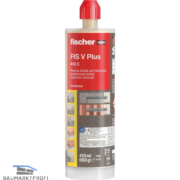 Der fischer Injektionsmörtel FIS V PLUS 410 C ist ein hochleistungsfähiger, styrolfreier Hybridmörtel in Kartuschenform zur Verankerung von Ankerstangen, Bewehrungen und Systemzubehör in Beton und Mauerwerk.