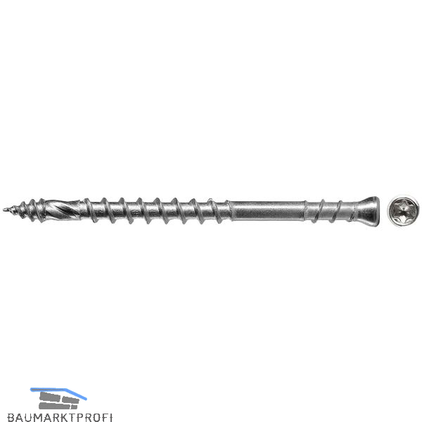 Die Schrauben haben einen kleinen Zylinderkopf mit TX-Antrieb und Doppelgewinde. Die Gewinde unter dem Kopf sind in entgegengesetzter Richtung ausgerichtet und gewährleisten so ein effektives Anziehen der Terrassendielen ohne Spalt zum Untergrund. Das Design der Spitze gewährleistet ein schnelles Eindrehen und reduziertes Spaltverhalten im Holz. Edelstahl A4 sorgt für eine extrem langlebige Lösung.