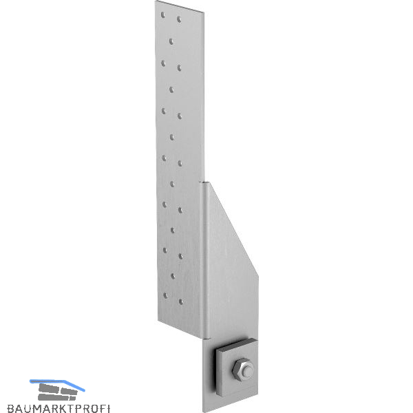 Die Zuglaschen gekröpft, werden bereits während der Produktion der Wände vormontiert und die Wand wird komplett verschlossen. Für die bündige Montage der Beplankung wird eine in der Schwelle 3,0 mm tiefe Ausfräsung empfohlen. Endmontage auf der Baustelle. Auf der Baustelle wird der Fußwinkel bündig auf der Bodenplatte montiert. Unebenheiten in der Bodenplatte bis zu 30 mm werden über die Verzahnung schnell und einfach justiert und mit einer Mutter M10 fixiert.