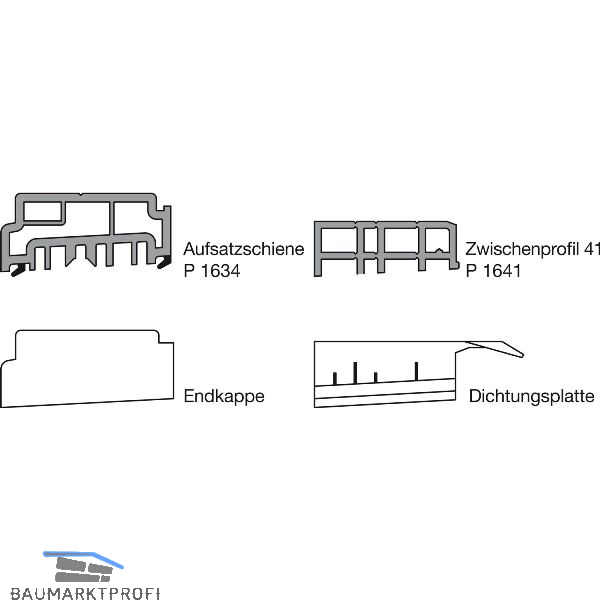 Lieferumfang:1 Aufsatzschiene P 16341 Zwischenprofil 41 P 16412 Endkappen inkl. Dichtplatten (links/rechts)1 Dichtungsplatte