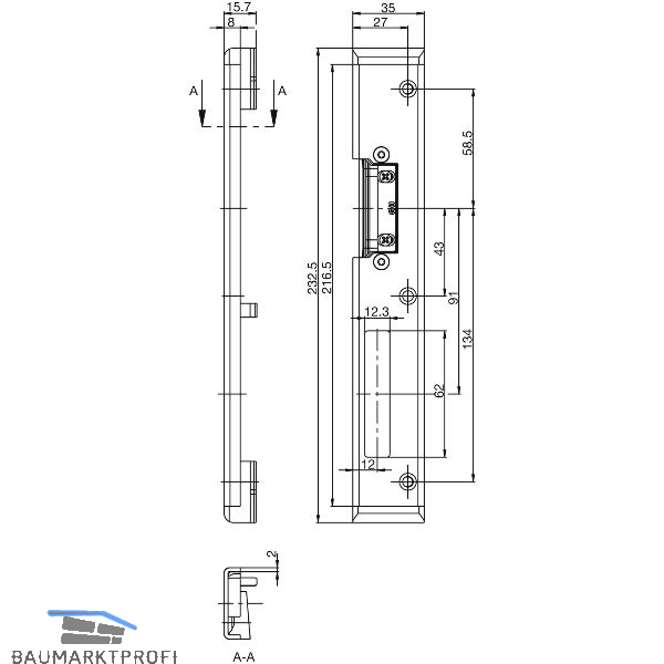 Ausführung: Schließblech zum Aufschrauben verstellbar, mit Austauschstück und Endstück, mitte Falle 146 mm