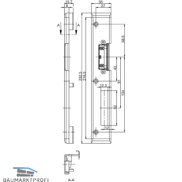 Ausführung: Schließblech zum Aufschrauben verstellbar, mit Austauschstück und Endstück, mitte Falle 146 mm