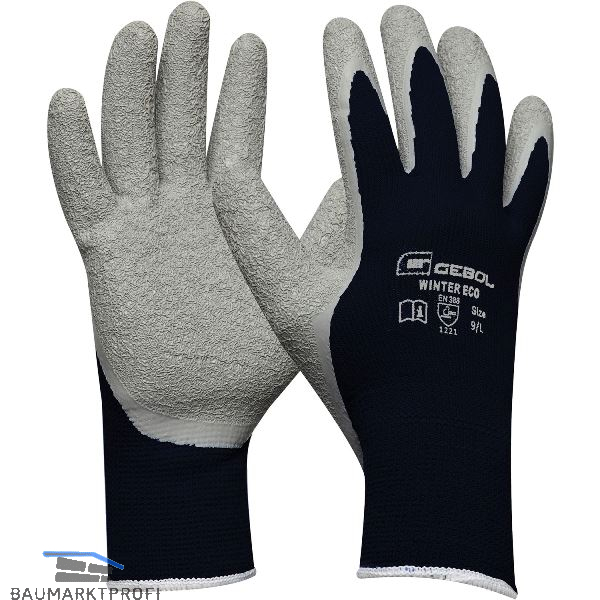 Marke: Gebol Größe: 10 Material: Polyester Beschichtung: Latex-Crinkle Farbe: Schwarz/Grau Norm: EN 388 Kategorie: Kategorie II Type: Winter Eco Abriebfestigkeit: 1 Schnittfestigkeit nach EN388:2003: 2 Reißfestigkeit: 2 Stichfestigkeit: 1