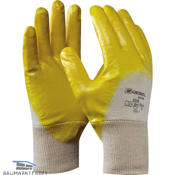 Profiqualität in Baumwolle mit 3/4 Nitril Beschichtung, hoher Tragekomfort, mit Strickbund, öl- und fettabweisend.Einsatzbereich: Baugewerbe.