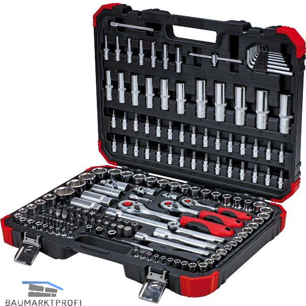 1/2" Antrieb: Einsätze-Sechskant: 10, 11, 12, 13, 14, 15, 16, 17, 18, 19, 20, 21, 22, 24, 27, 30, 32 mm, Einsätze-Sechskant-lang: 16, 17, 18, 19, 22 mm, E-TX-Einsätze : E20, E24, Zündkerzen-Einsatz: 16, 21 mm, Adapter-Gleitstück 3/8" x 1/2", Verlängerung: 125 mm + 250 mm, Hebelumschaltknarre , 72 Zähne, 250 mm, Adapter für 10 mm Bits, Kardangelenk 66 mm.