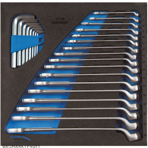 Für die Schubfachordnung in den Gedore Werkzeugwagen und Rollwerkbänken mit variabler Schubfachunterteilung. Einfache optische Vollständigkeitsprüfung durch 2-farbige Schaumstoffeinlagen. Besonders geeignet für Arbeiten in sensiblen Bereichen, in denen sichergestellt werden muß, dass kein Werkzeug zurückbleibt. Unterlage blau, Oberlage schwarz. Die Farbe signalisiert fehlendes Werkzeug. Das Werkzeug liegt verrutschsicher in seinem Nest und ist vor Beschädigungen geschützt. Griffmulden erleichtern das Herausnehmen des Werkzeuges. Resistent gegen Öle und Fette, leicht zu Reinigen mit Wasser, Seife und einer Hand-/Nagelbürste.