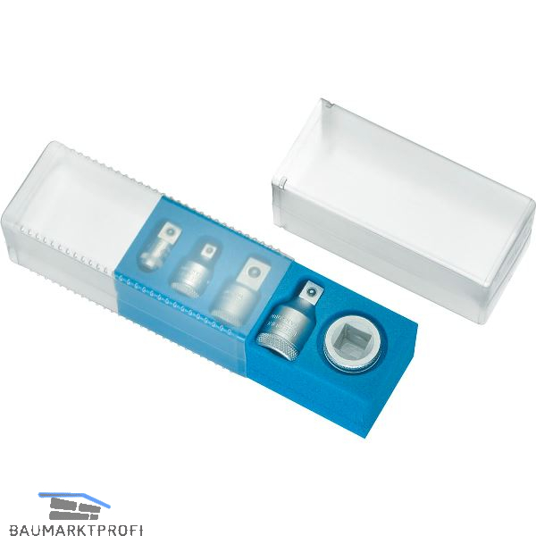 Satz mit Reduzier- und Vergrößerungsstücken von 1/4" bis 3/4". Im transparenten Kunststoffkoffer.
