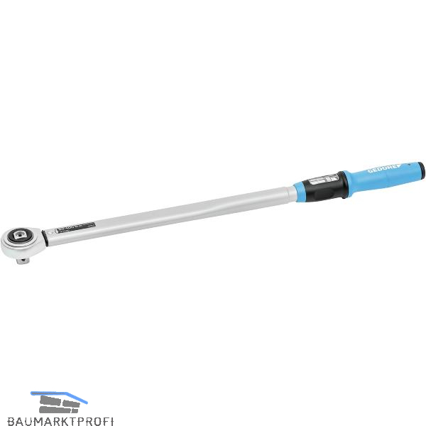 Verstellbarer, auslösender und robuster Rohrdrehmomentschlüssel mit integrierter Knarre mit Vierkantantrieb für Industrie und Handwerk. Kalibriert auf eine maximal zulässige Abweichung von +/- 3 % und somit präziser, als die in der Norm geforderten +/- 4 %. Für den kontrollierten Rechts- und Linksanzug (Vierkant umstecken für Richtungswechsel). Robuste, matt gepulverte Stahlrohr-Konstruktion, mit verzinkter Knarre und hochwertigen Kunststoffteilen. Neuer ergonomischer Griff, geformt nach der natürlichen Greifhaltung der Hand. Deutlich erkennbare und fühlbare Handzentrierhilfe sowie Kalibrierhilfe in der Griffmitte. Vertikale Ausrichtung der Skala, Drehmomenteinstellung dadurch Links- Rechtshänder geeignet. Wegrollsicherung, verhindert Wegrollen wenn das Werkzeug abgelegt wird.