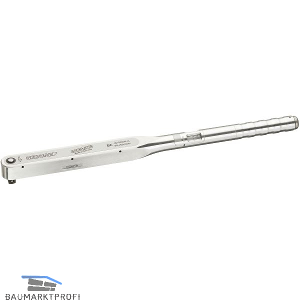 Drehmomentschlüssel mit Einfachvierkantantrieb für den kontrollierten Rechtsanzug, Antriebsvierkant mit Kugelsicherung, automatische Kurzwegauslösung mit fühlbarem und hörbarem Signal, Auslösegenauigkeit +/- 3 % Toleranz vom eingestelltem Skalenwert, Gehäuse aus Aluminium-Legierung, Doppelskala. Mit Druckknopfauslösung.
