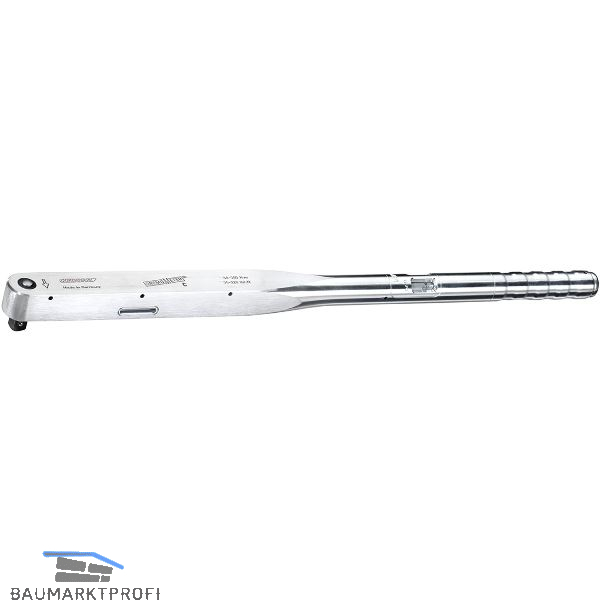 Drehmomentschlüssel mit Doppelvierkantantrieb für den kontrollierten Rechts-und Linksanzug, Antriebsvierkant mit Kugelsicherung, automatische Kurzwegauslösung mit fühlbarem und hörbarem Signal, Auslösegenauigkeit +/- 3 % Toleranz vom eingestelltem Skalenwert, Gehäuse aus Aluminium-Legierung, Doppelskala. Mit Druckknopfauslösung.