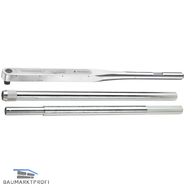 Drehmomentschlüssel mit Doppelvierkantantrieb für den kontrollierten Rechts-und Linksanzug, Antriebsvierkant mit Kugelsicherung, automatische Kurzwegauslösung mit fühlbarem und hörbarem Signal, Auslösegenauigkeit +/- 3 % Toleranz vom eingestelltem Skalenwert, Gehäuse aus Aluminium-Legierung, Einfachskala. Mit Stiftsicherung und 2 Alu-Verlängerungsrohren.