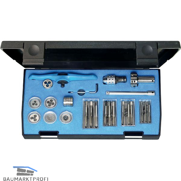 Für Innengewinde M3 - M6. Für Außengewinde M3 - M6 max. 40 mm lang. Ratschengetriebenes System mit Verlängerungseinheit. Zusätzliche Führungshülse für Außengewinde zum achssymetrischen Schneiden mit Spänesammler. In Kunststoffbox.