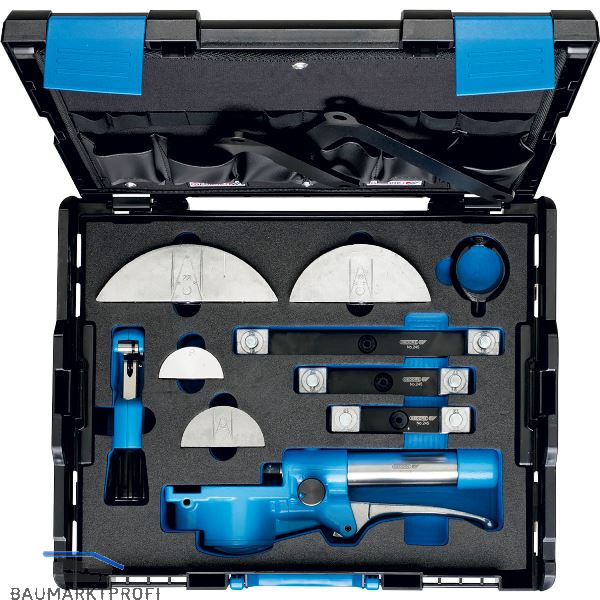 Abmessungen von 6 bis 22 mm Ø bis 90°. Für weiche Kupferrohre EN 1057 bis 22 mm (auch wärmeisoliert), Mehrschichtverbundrohre bis 20 mm, Präzisionsstahlrohre EN 10305-3 (DIN 2394) bis 18 x 2 mm sowie geglühte Edelstahlrohre bis 18 x 1,2 mm. Mit 10 Biegeformen für Rohre mit Ø 6, 8, 10, 12, 14, 15, 16, 18, 20 und 22 mm und entsprechenden Gegenhaltern. Hydraulischer Antrieb für geringen Kraftaufwand.