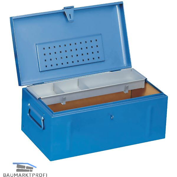 Stahlblechkonstruktion mit Tragegriffen, robusten Beschlägen und Deckelarretierung in geöffneter Stellung, spritzwassergeschützt. Spezialinnenauskleidung mit Planfach und Kleinteileeinsatz. Tragkraft bis zu 400 kg ohne Verwendung der Fallgriffe, beim Anheben statische Tragkraft der Fallgriffe max. 150 kg.